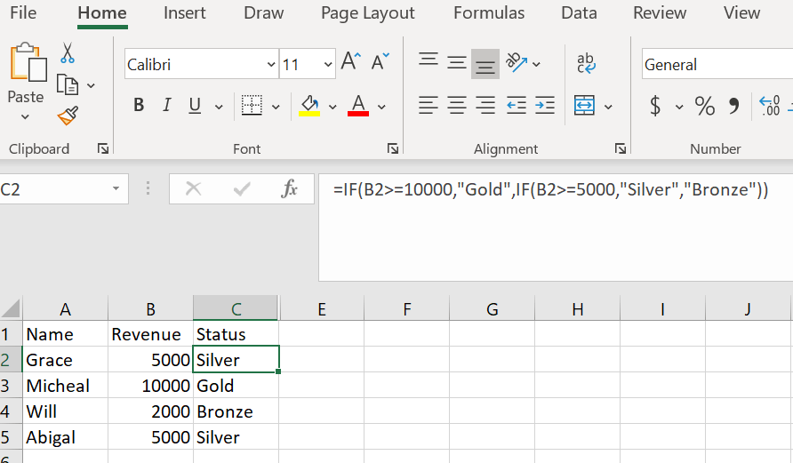 =IF(B2>=10000,”Gold”,IF(B2>=5000,”Silver”,”Bronze”))