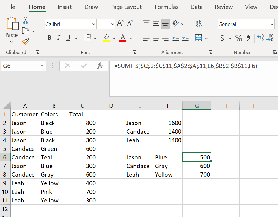 You give the sum range, then the criteria range for the first evaluation followed by the criteria value. You add a comma then give the second criteria range follow by the criteria value for the second evaluation.Here is the formula written out:=SUMIFS($C$2:$C$11,$A$2:$A$11,E6,$B$2:$B$11,F6)We look first at the SUM range for the formula C2:C11. We then state the criteria range for the first evaluation. We are looking for a name in column A so A2:A11. We tell the formula that it is Jason’s name we are looking for by giving E6 as the value. We add a comma and then give the second criteria range for our formula which is colors B2:B11. We then tell the formula that we are looking for the value Blue by giving the formula F6. We get only the sum of Jason – Blue.